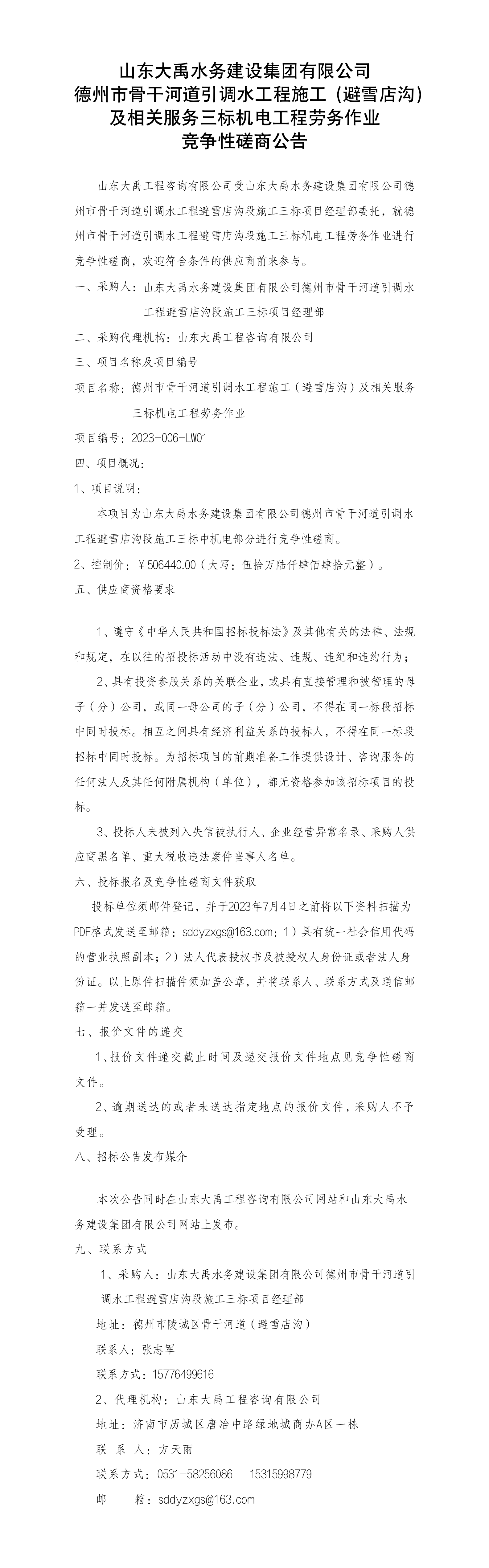 山東大禹水務(wù)建設(shè)集團(tuán)有限公司德州市骨干河道引調(diào)水工程施工(避雪店溝)及相關(guān)服務(wù)三標(biāo)機電工程勞務(wù)作業(yè)競爭性磋商公告