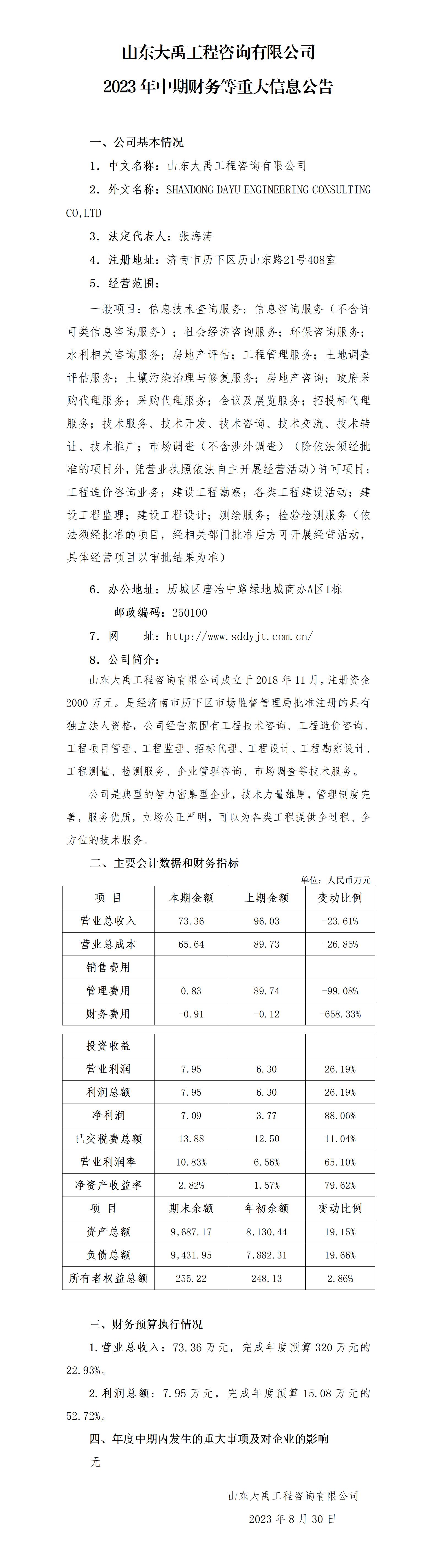 山東大禹工程咨詢有限公司2023年中期財(cái)務(wù)等重大信息公告