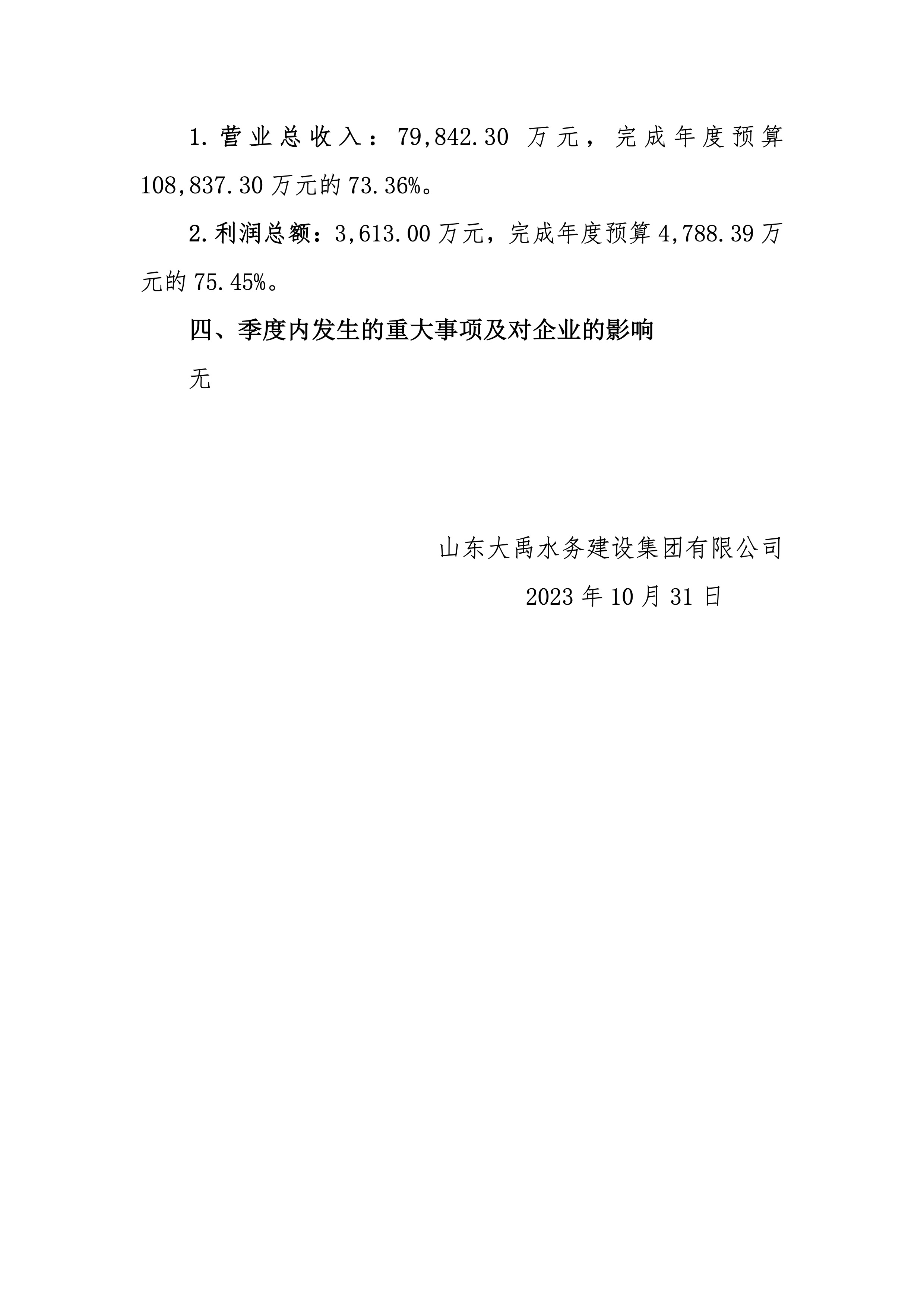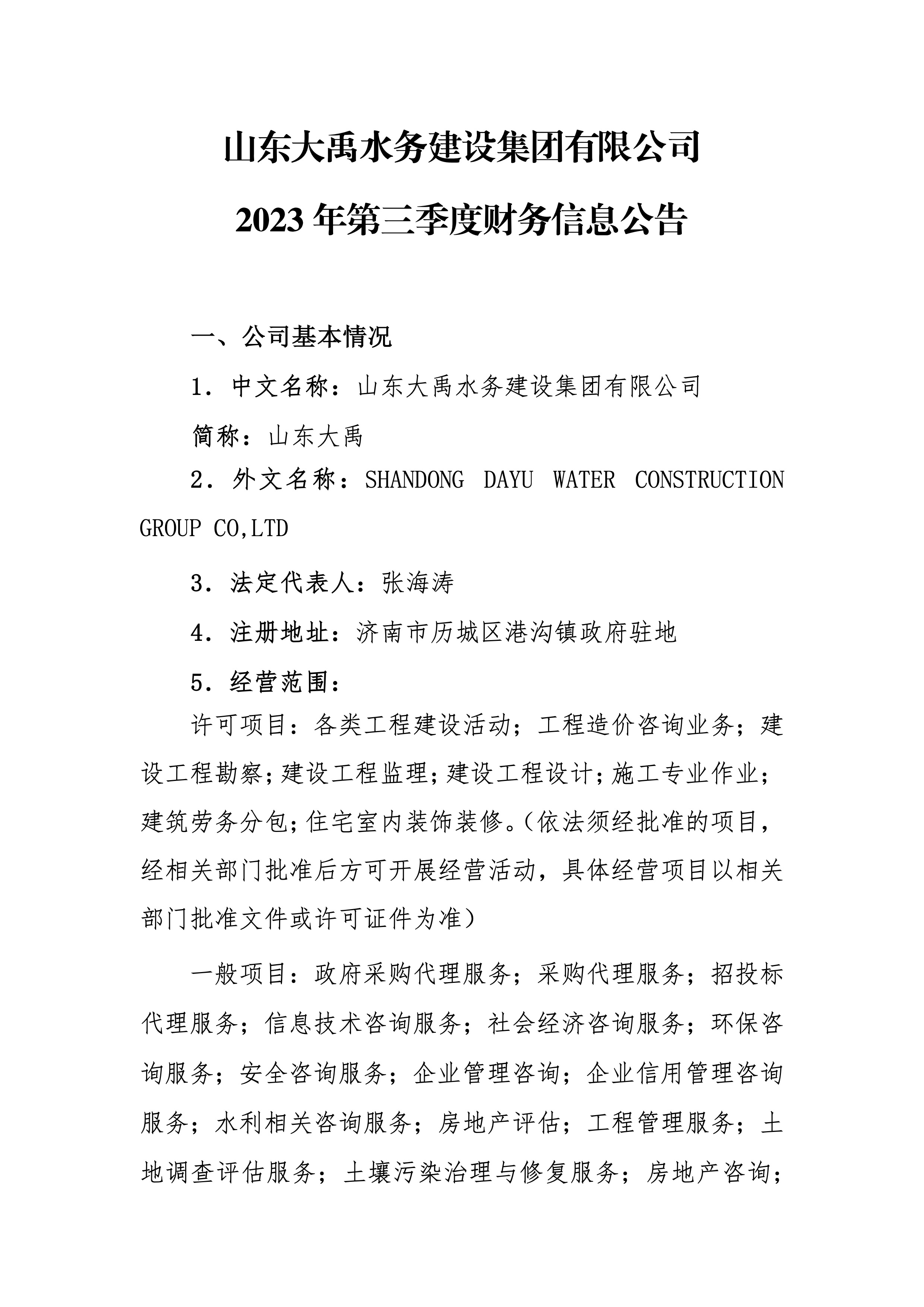 山東大禹水務(wù)建設(shè)集團(tuán)有限公司2023年第三季度財務(wù)信息公告