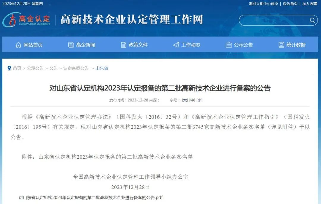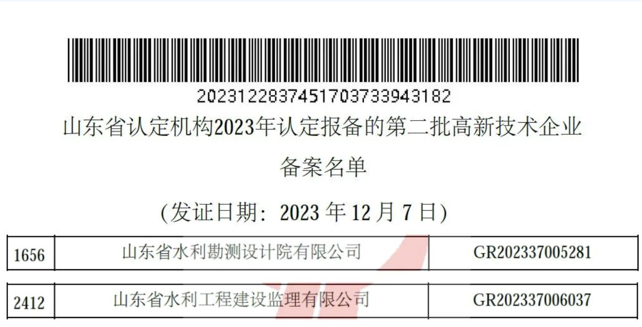 2023年12月28日,全國高新技術企業認定管理工作領導小組辦公室公告了山東省2023年認定報備的第二批高新技術企業名單,山東省水利勘測設計院有限公司(以下簡稱公司總部)和權屬企業山東省水利工程建設監理有限公司(以下簡稱監理公司)位列其中。公司總部是第三次通過國家高新技術企業認定,監理公司則是首次通過認定,這標志著公司總部和權屬一級企業全部通過國家高新技術企業認定。作為山東水設權屬企業的山東大禹水務建設集團有限公司、山東省水利工程試驗中心有限公司均于2022年首次通過國家高新技術企業認定。