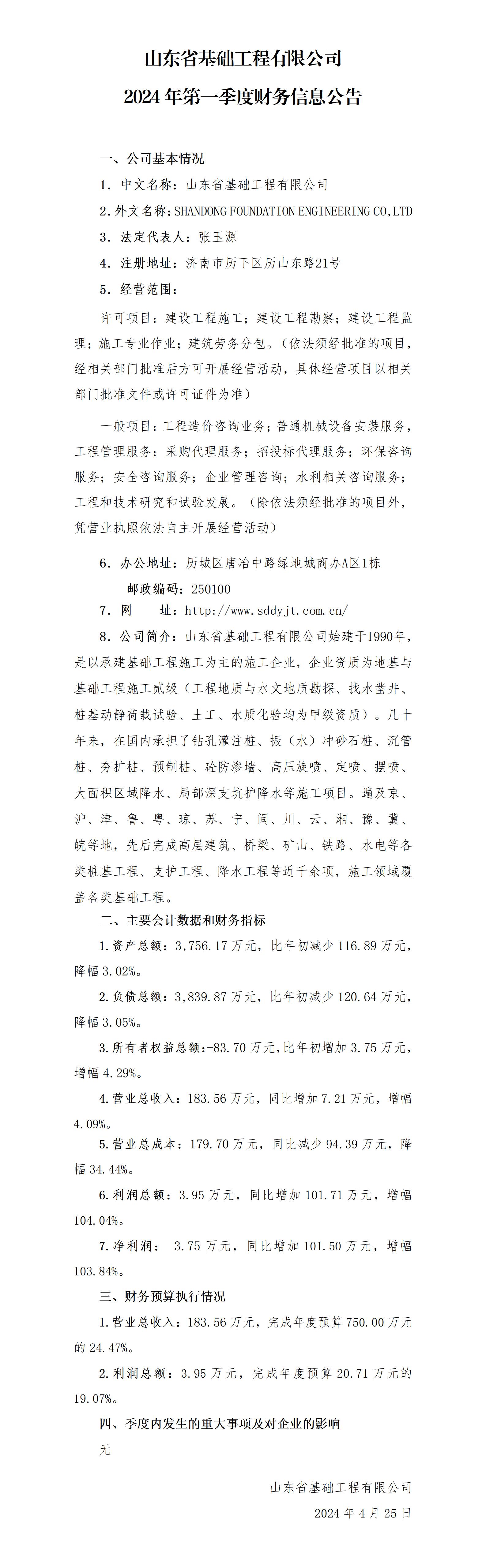 山東省基礎(chǔ)工程有限公司2024年第一季度財(cái)務(wù)信息公告