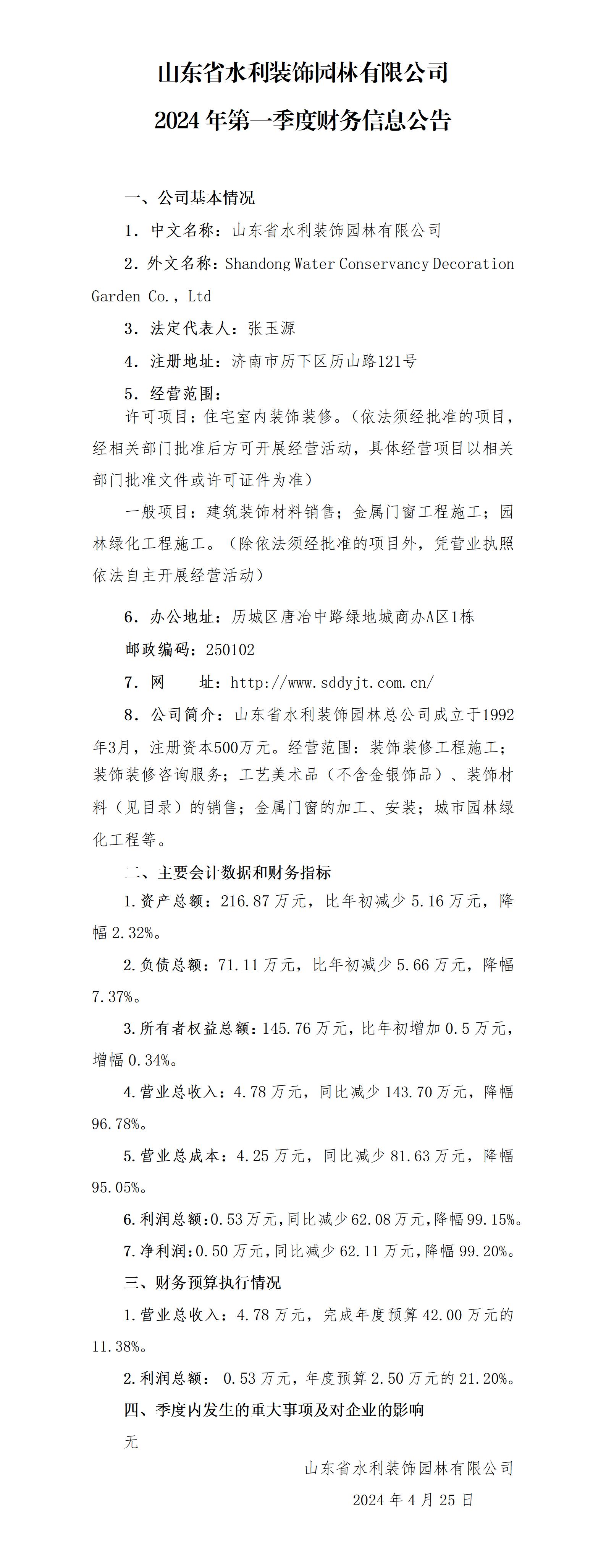 山東省水利裝飾園林有限公司2024年第一季度財(cái)務(wù)信息公告