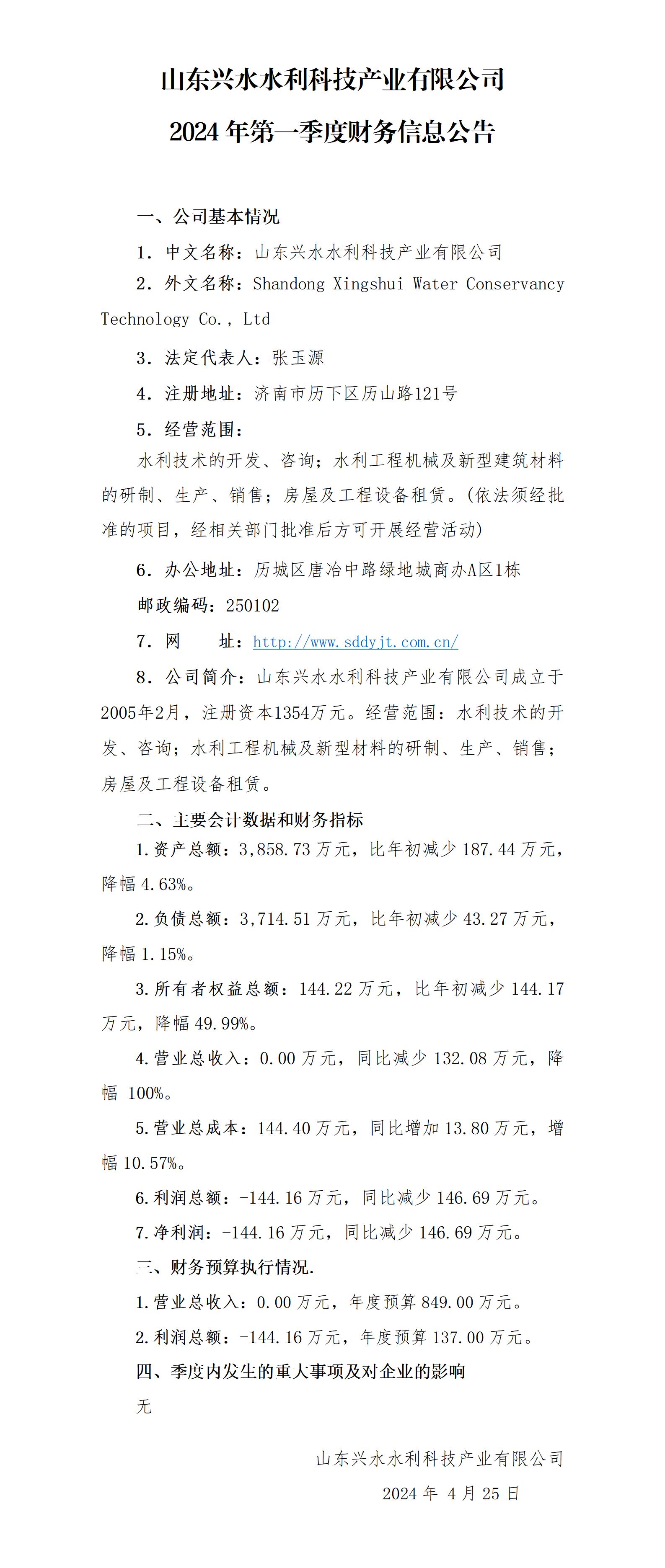 山東興水水利科技產(chǎn)業(yè)有限公司2024年第一季度財(cái)務(wù)信息公告