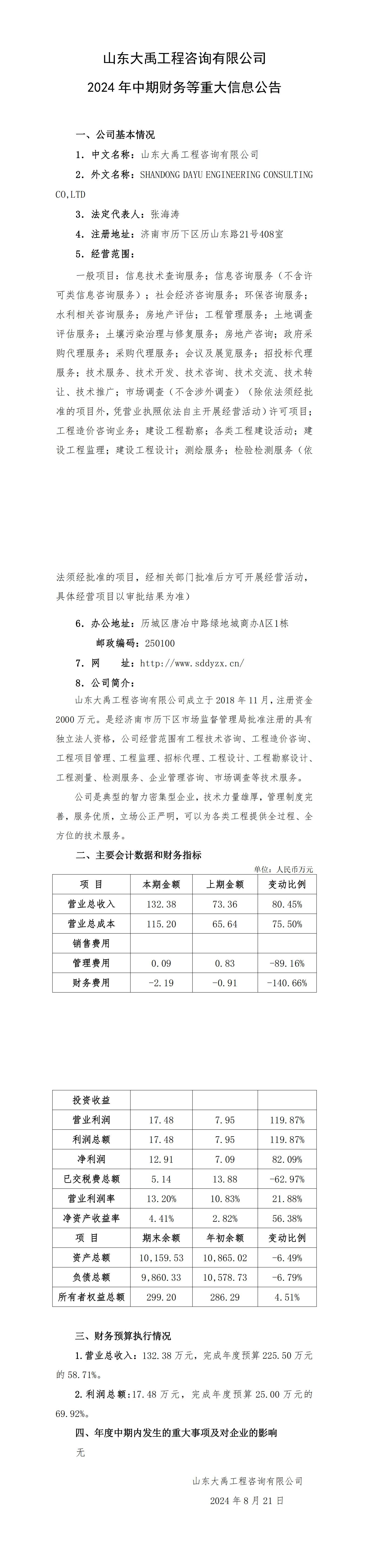 山東大禹工程咨詢有限公司2024年中期財務等重大信息公告