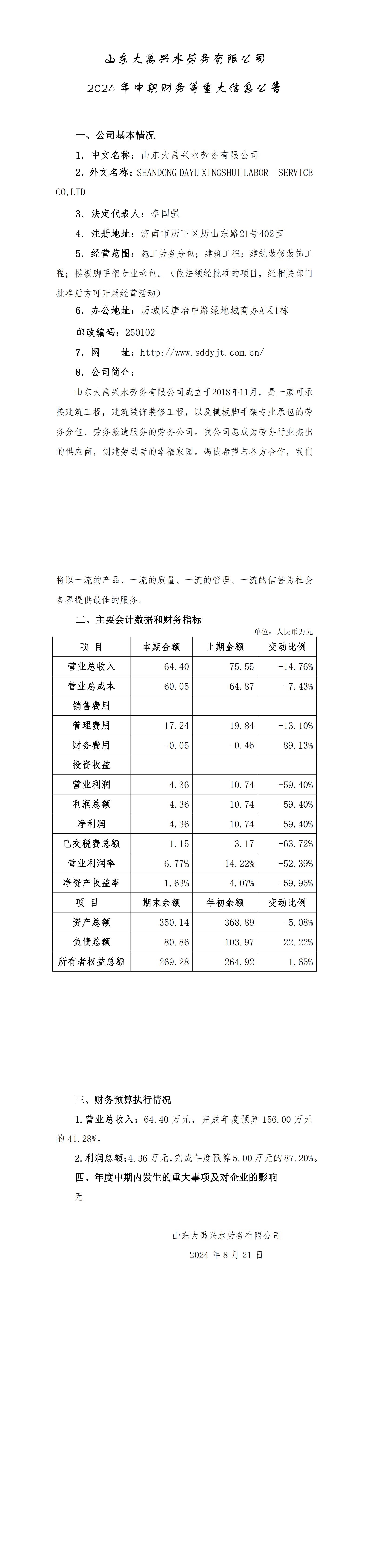 山東大禹興水勞務有限公司2024年中期財務等重大信息公告
