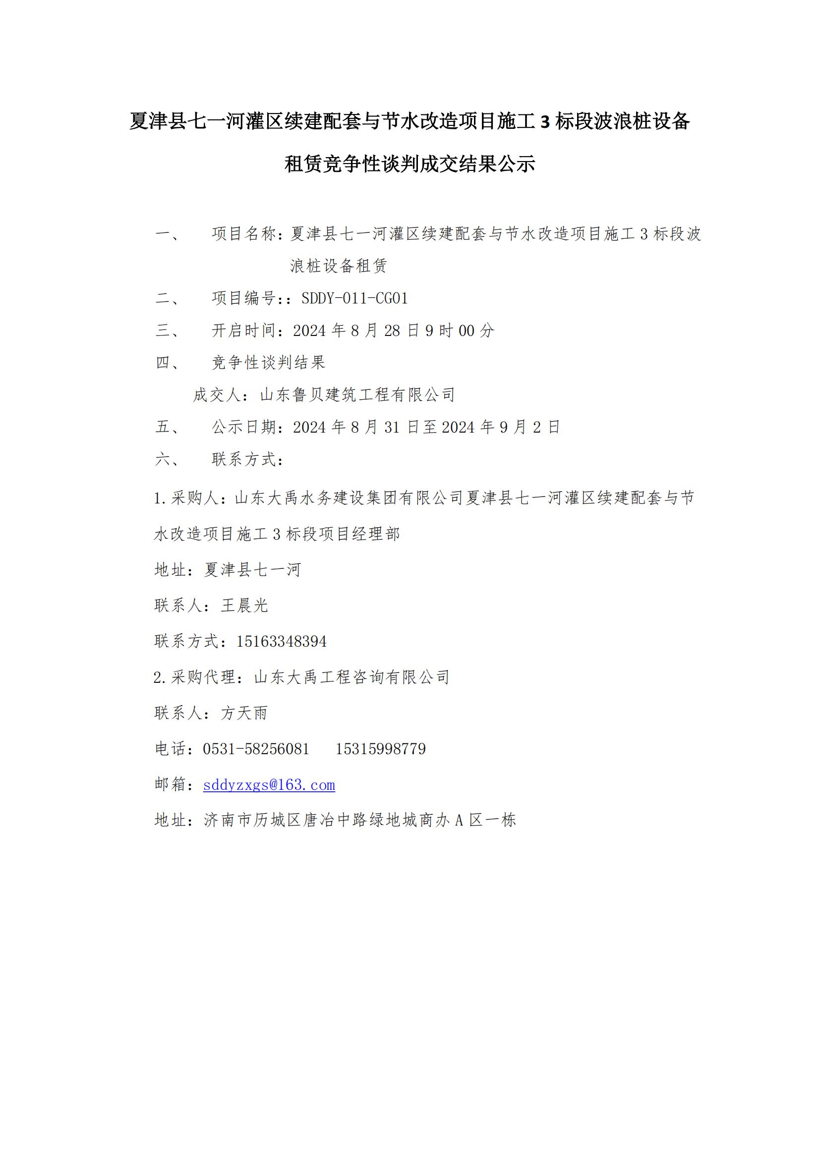 夏津縣七一河灌區(qū)續(xù)建配套與節(jié)水改造項(xiàng)目施工 3 標(biāo)段波浪樁設(shè)備 租賃競(jìng)爭(zhēng)性談判成交結(jié)果公示