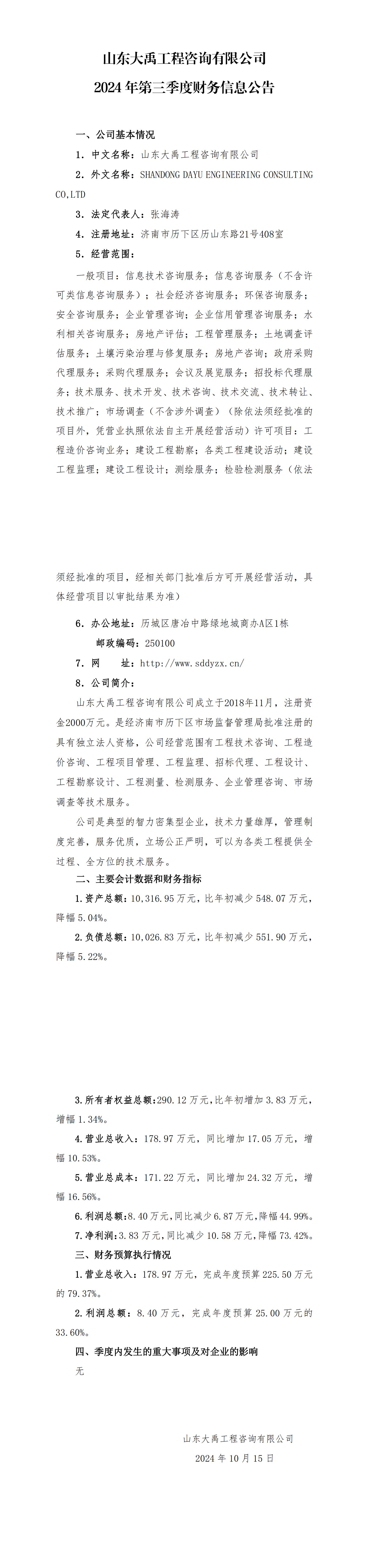 山東大禹工程咨詢有限公司2024年第三季度財務信息公告
