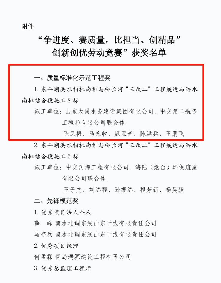 近日,集團(tuán)公司承建的東平湖洪水相機(jī)南排與柳長(zhǎng)河 “三改二”工程航運(yùn)與洪水南排結(jié)合段施工8標(biāo)獲評(píng)山東省水利廳創(chuàng)新創(chuàng)優(yōu)勞動(dòng)競(jìng)賽“質(zhì)量標(biāo)準(zhǔn)化示范工程獎(jiǎng)”。