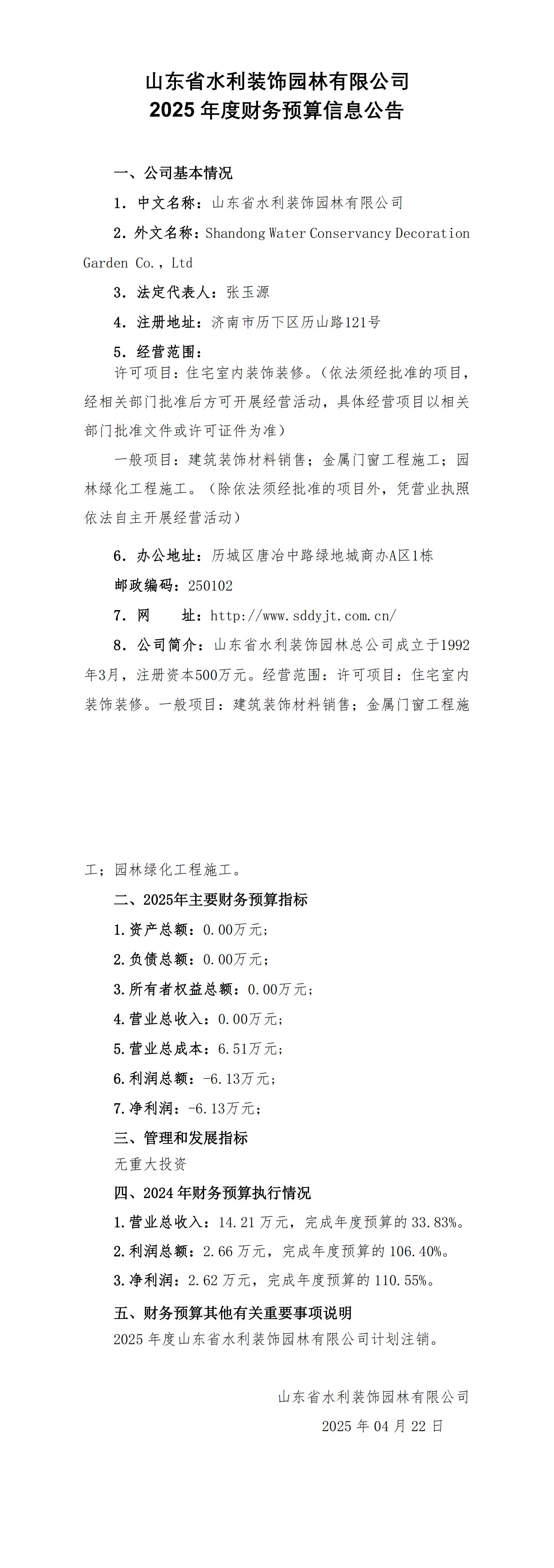 山東省水利裝飾園林有限公司2025年度財務預算信息公告