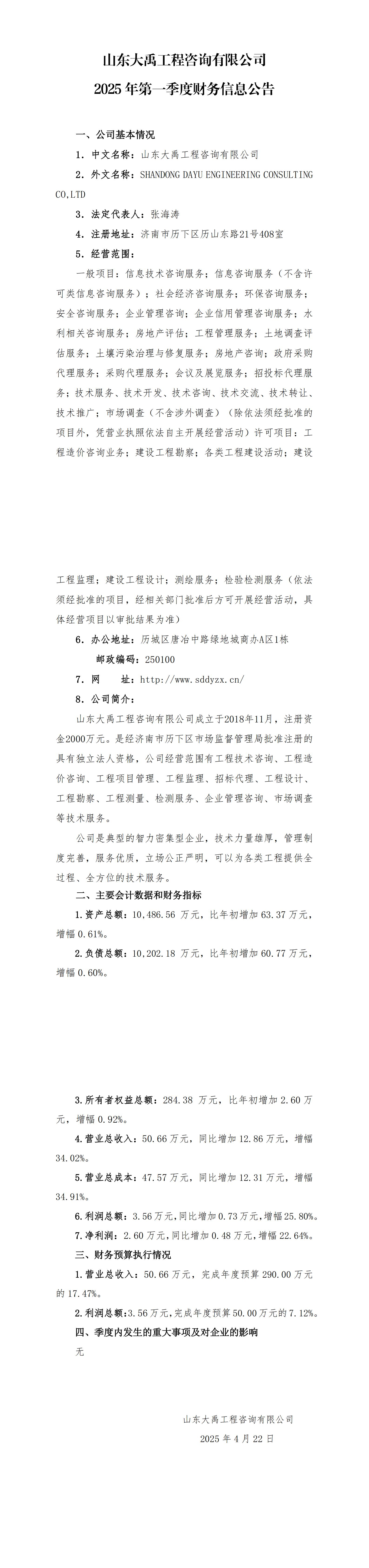 山東大禹工程咨詢有限公司2025年第一季度財務信息公告