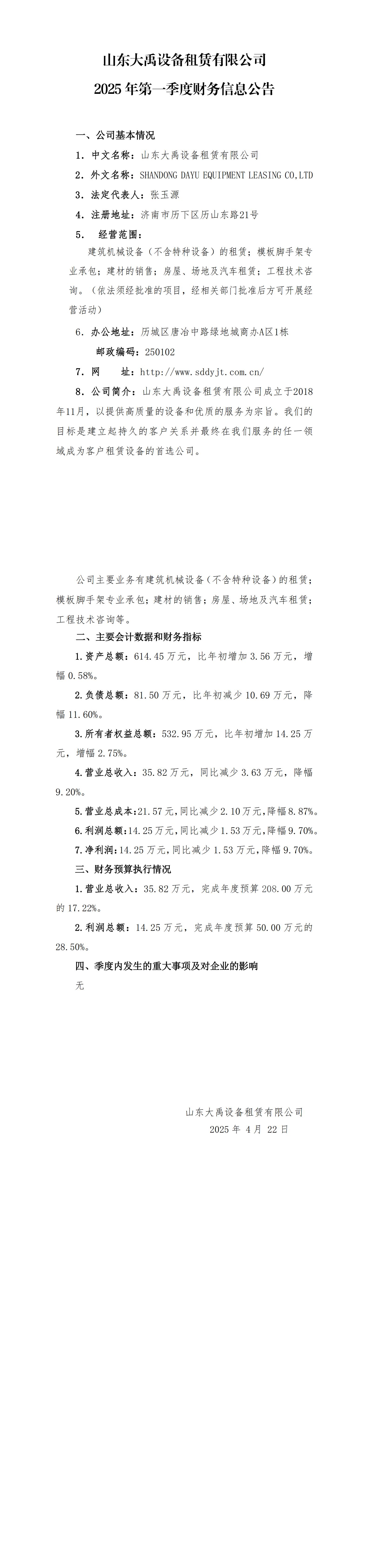 山東大禹設備租賃有限公司2025年第一季度財務信息公告