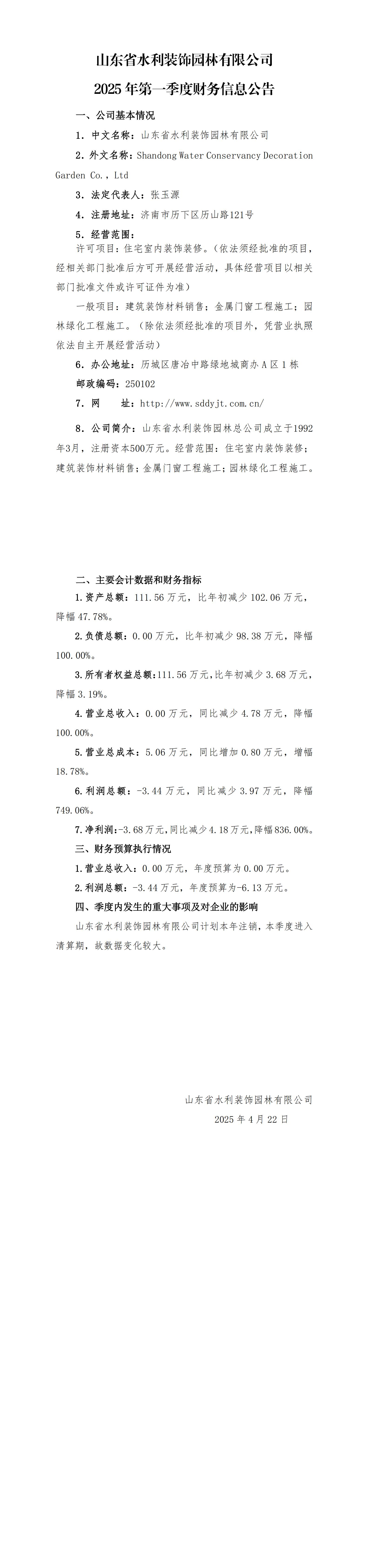 山東省水利裝飾園林有限公司2025年第一季度財務信息公告