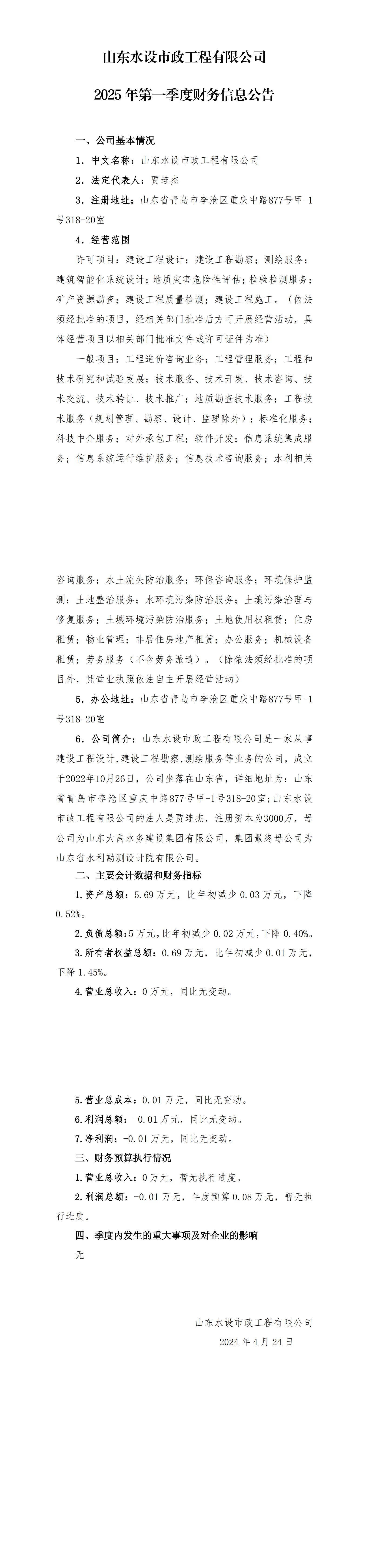 山東水設(shè)市政工程有限公司2025年第一季度財(cái)務(wù)信息公告