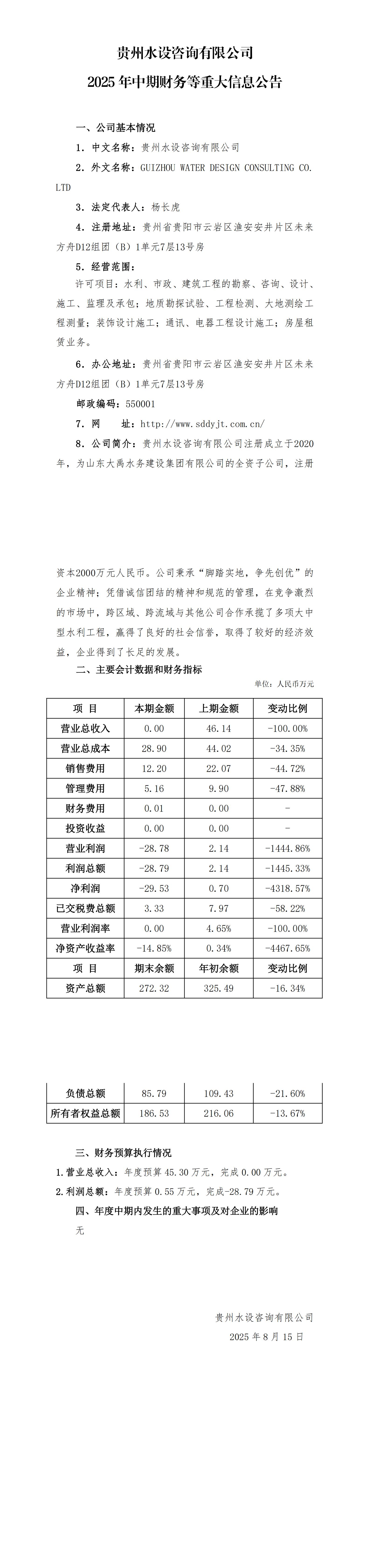 貴州水設(shè)咨詢有限公司2025年中期財(cái)務(wù)等重大信息公告