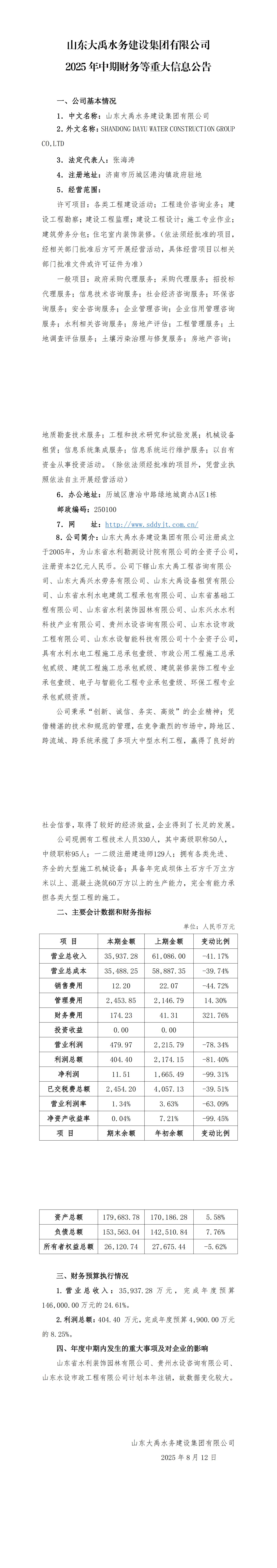 山東大禹水務建設集團有限公司2025年中期財務等重大信息公告