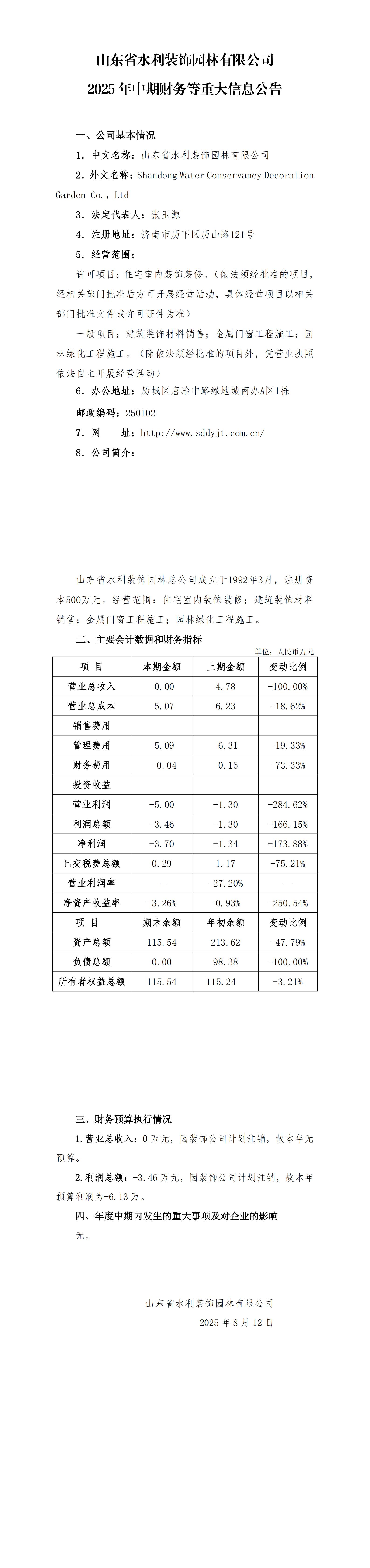 山東省水利裝飾園林有限公司2025年中期財務等重大信息公告