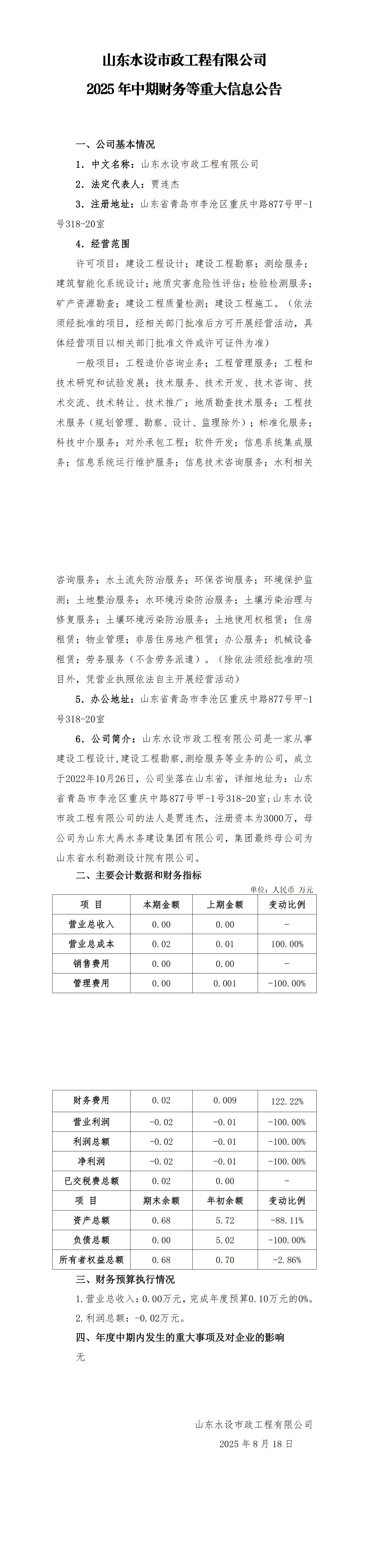 山東省水利裝飾園林有限公司2025年中期財務等重大信息公告