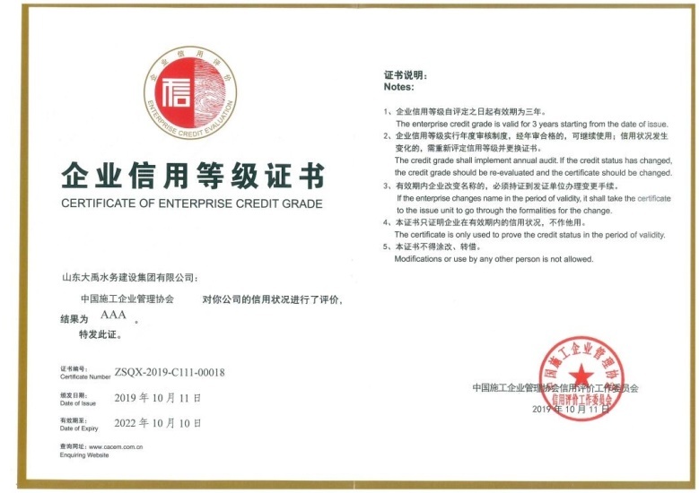 企業(yè)社會(huì)信用評(píng)價(jià)工作政策性強(qiáng)、關(guān)注度高,是企業(yè)進(jìn)行市場(chǎng)準(zhǔn)入、投標(biāo)資格審查、行業(yè)評(píng)優(yōu)評(píng)先的重要依據(jù)之一。中國(guó)施工企業(yè)管理協(xié)會(huì)信用評(píng)價(jià)工作委員會(huì)通過(guò)對(duì)大禹集團(tuán)的生產(chǎn)經(jīng)營(yíng)、財(cái)務(wù)狀況和質(zhì)量安全等進(jìn)行綜合評(píng)價(jià),最終授予大禹集團(tuán)“工程建設(shè)企業(yè)社會(huì)信用評(píng)價(jià)AAA企業(yè)”榮譽(yù)稱號(hào)。