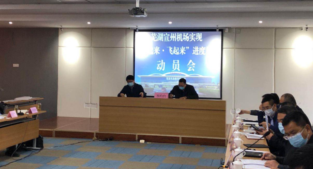 2020年4月28日上午,蕪湖宣城機場實現“建起來、飛起來”建設目標動員會在蕪湖縣召開,機場建設指揮部與各參建單位簽訂了責任書。蕪湖宣城機場建設投資有限公司董事長孫躍進、總經理許耀輝、蕪湖縣副縣長劉建軍、蕪湖市水務局總工程師李加高及29家參建單位參加會議,集團公司副總經理馬永收代表集團公司簽訂了責任書。