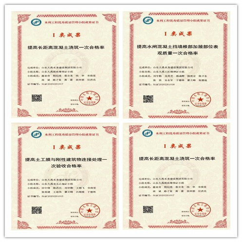 本次水利工程優秀質量管理小組成果評價,全國共申報1006項成果,涉及水利施工、設計、監理、咨詢等單位。經專家組初審、復審、現場評價等環節,最終確定701項水利工程優秀質量管理小組獲獎。其中一類成果216項,二類成果356項,三類成果189項。大禹集團本次申報的7項成果,其中《提高六棱預制板外觀質量合格率》等四項課題榮獲一類成果,《提高混凝土外觀優良率》等三項課題榮獲二類成果。