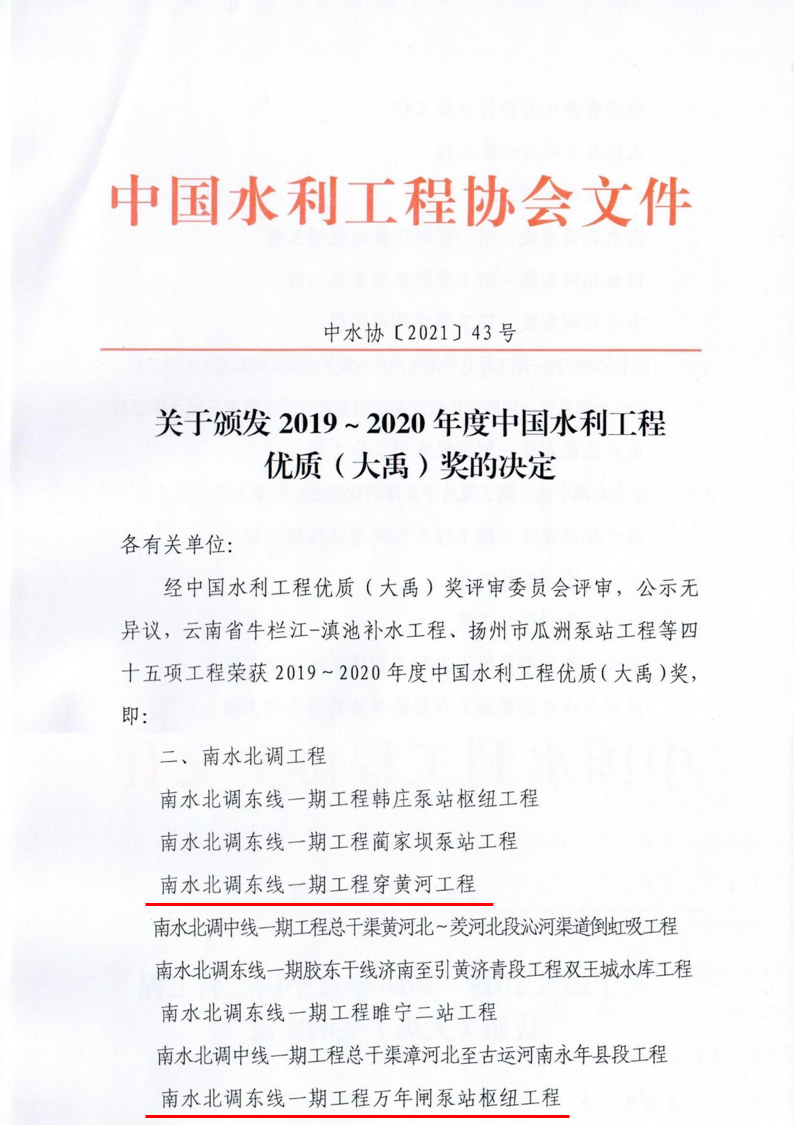集團公司承建的“南水北調東線一期工程穿黃河工程”,權屬公司山東省水利水電建筑工程承包有限公司承建的“南水北調東線一期工程萬年閘泵站樞紐工程”雙雙通過2019-2020年度中國水利工程優質(大禹)獎評選 ,榮獲中國水利工程優質(大禹)獎榮譽稱號。
